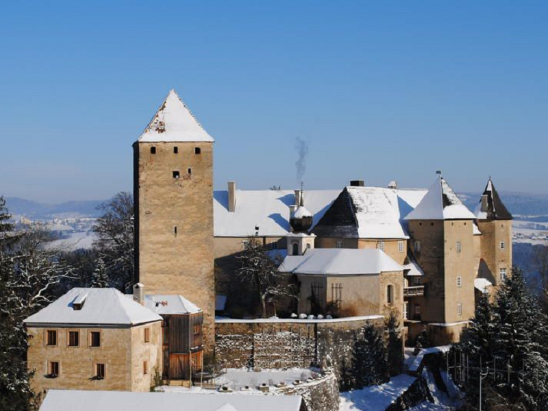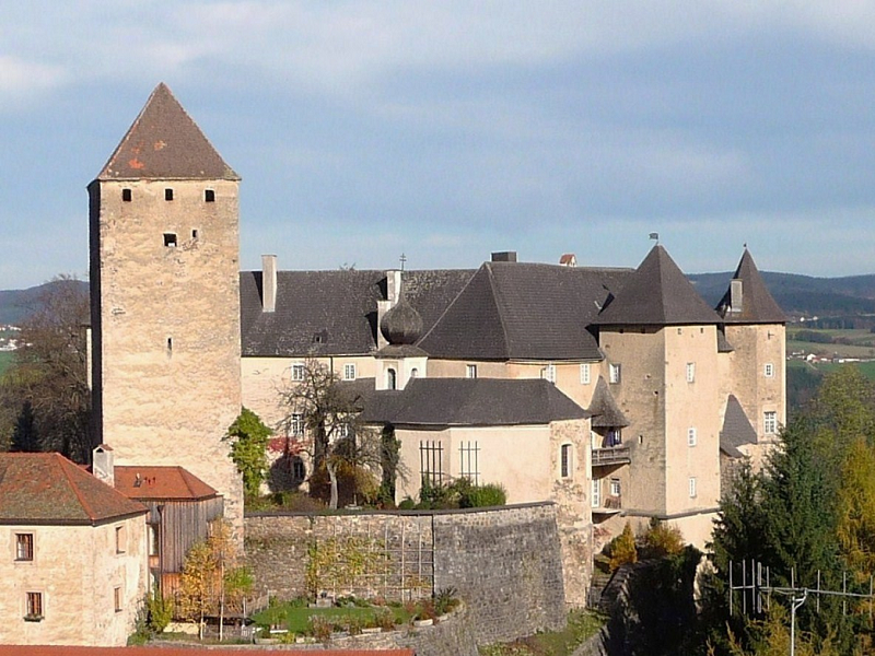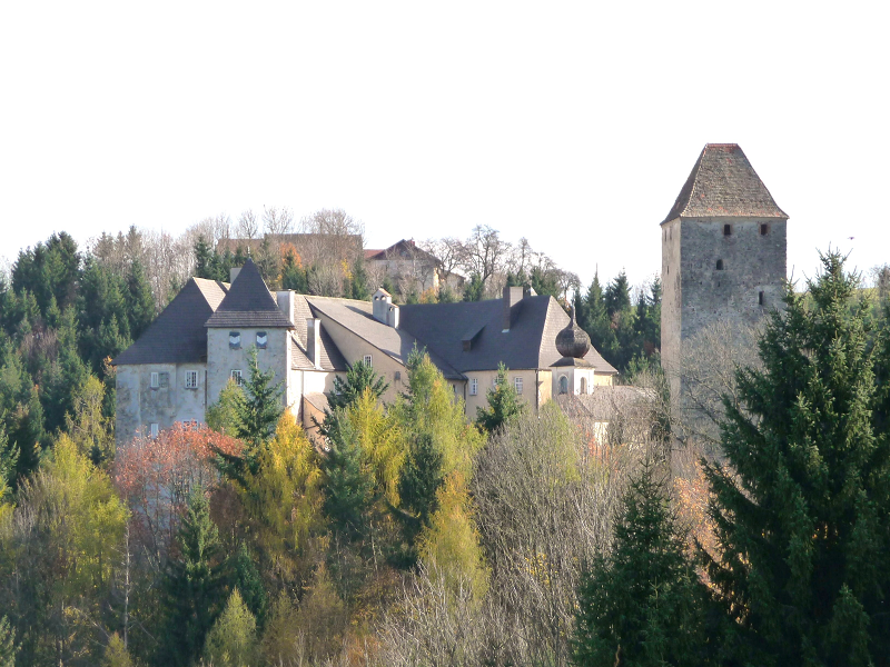 Vichtenstein Castle was built shortly after 1100 and has been continuously used and inhabited ever since. The alterations and modifications made over the centuries have helped to preserve the castle complex. Among the oldest parts of the castle is the imposing, now freestanding, square keep, which once guarded the entrance to the castle interior and the palas (residential building). The defensive walls that connected the keep and the gatehouse to the palas are only preserved in their basic outlines. The older sections of the palas were attached to the round northeast tower, which was later extended to a polygonal shape. The two square residential towers in the northwest and southeast were probably built in the 15th or 16th century. The castle chapel was built in the 14th century and enlarged in the 17th century. The older part is covered with a cross-ribbed vault with figural keystones, the newer part with a barrel vault. Vichtenstein experienced its most turbulent times in the 13th century, when the castle was pledged to the Bishopric of Passau so that the proceeds could finance a crusade to the Holy Land.