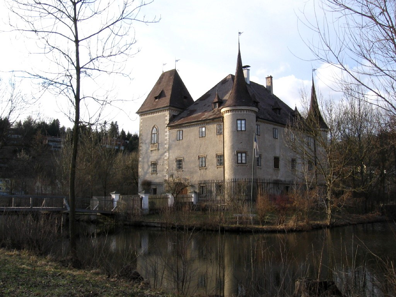 Coming from Linz, Weyer Castle, a moated castle, lies at the northern entrance to the town. First documented in 1299 in the land register of Kremsmünster Abbey, the Fenzl von Paumgarten family united the estates of Piberbach and Weyer into a single lordship in 1596. After the ownership of the Kazian family, the Hager von Allentsteig family, and the Eyselsberg family, it reverted to Kremsmünster Abbey in 1769. In 1812, it was acquired by the Linz banker Franz Planck von Planckburg from the so-called Religious Fund estates. The main structure of the castle, with its false ashlar masonry, likely dates from the Renaissance period and underwent a slight Neo-Gothic remodeling in 1871, featuring a uniform russet plaster finish. The current "Lords of Weyer" are Alexander and [name missing]. Marion Planck, who uses the castle not only as a residence and headquarters for forestry, but also as an architecture and spatial planning office, which currently provides a workplace for six people.